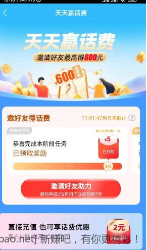 天猫App天天赢话费的活动,每天分享给3个天猫号助力可以领取5元话费券,充话费30-5。每个天猫号每天可以助力一次。比如今天A分享给B、C、D助力,明天A还可以分享给BCD助力。