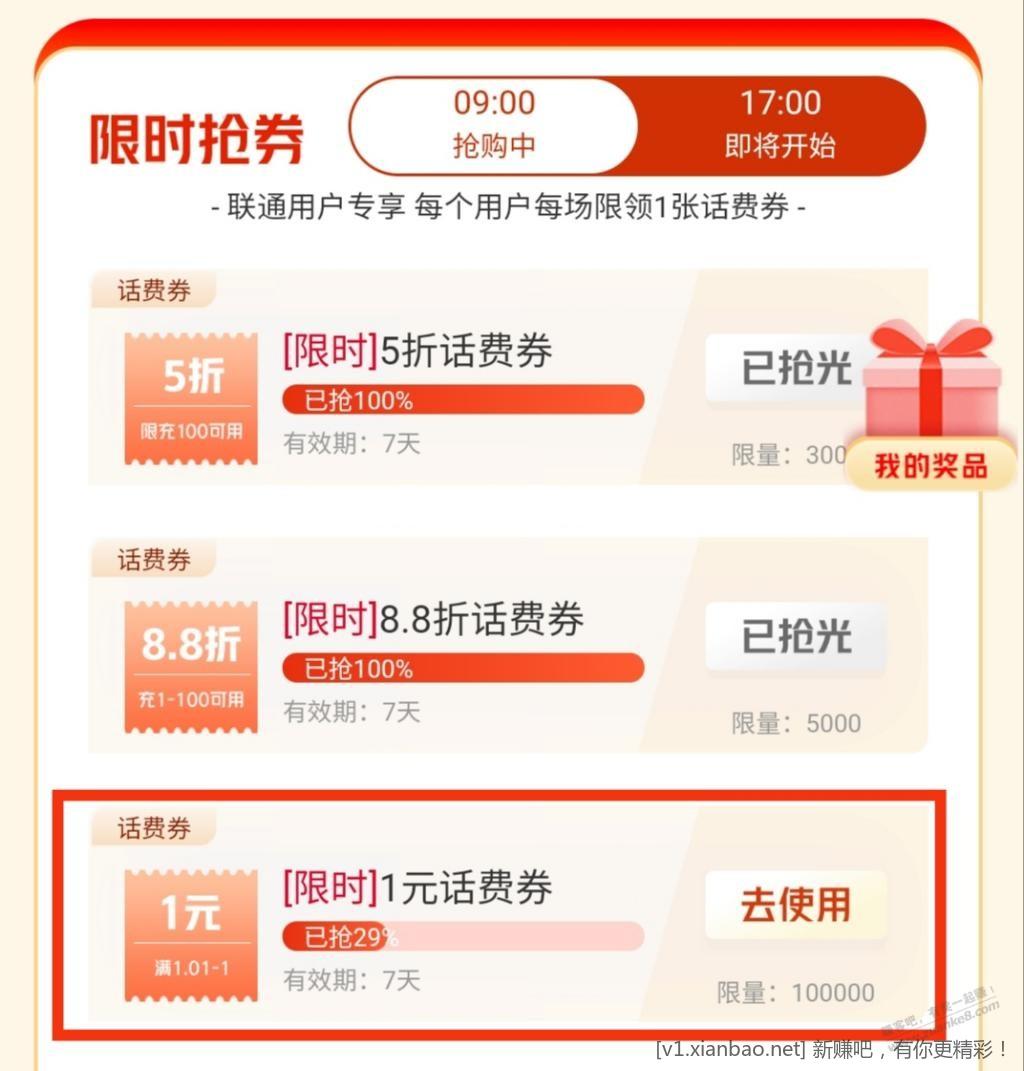 联通app-充话费五折横幅进去。下拉找到1元话费券,然后交费,自定义,输入1.01,支付0.01充1.01话费