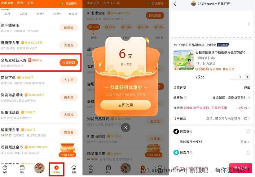 番茄畅听APP->抖音授权登录->领取6~10元无门槛券,点立即使用进入 任选实物0.01元包邮