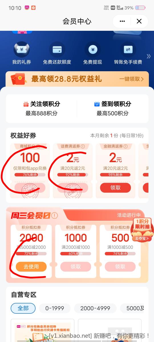 中国移动和包APP 限中国移动 会员中心 权益好券 星期三