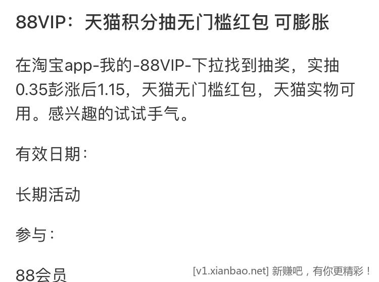 实测88积分抽了0.36红包,膨胀后2.2红包。天猫通用的,可以的
