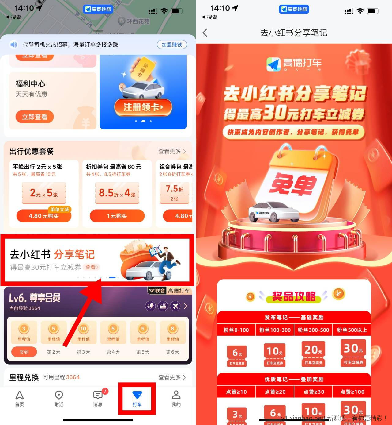 高德打车分享小红书得打车券-高德地图APP底部“打车”->轮播图“去小红书分享笔记”->根据页面发小红书领6~30亓无门槛打车卷
