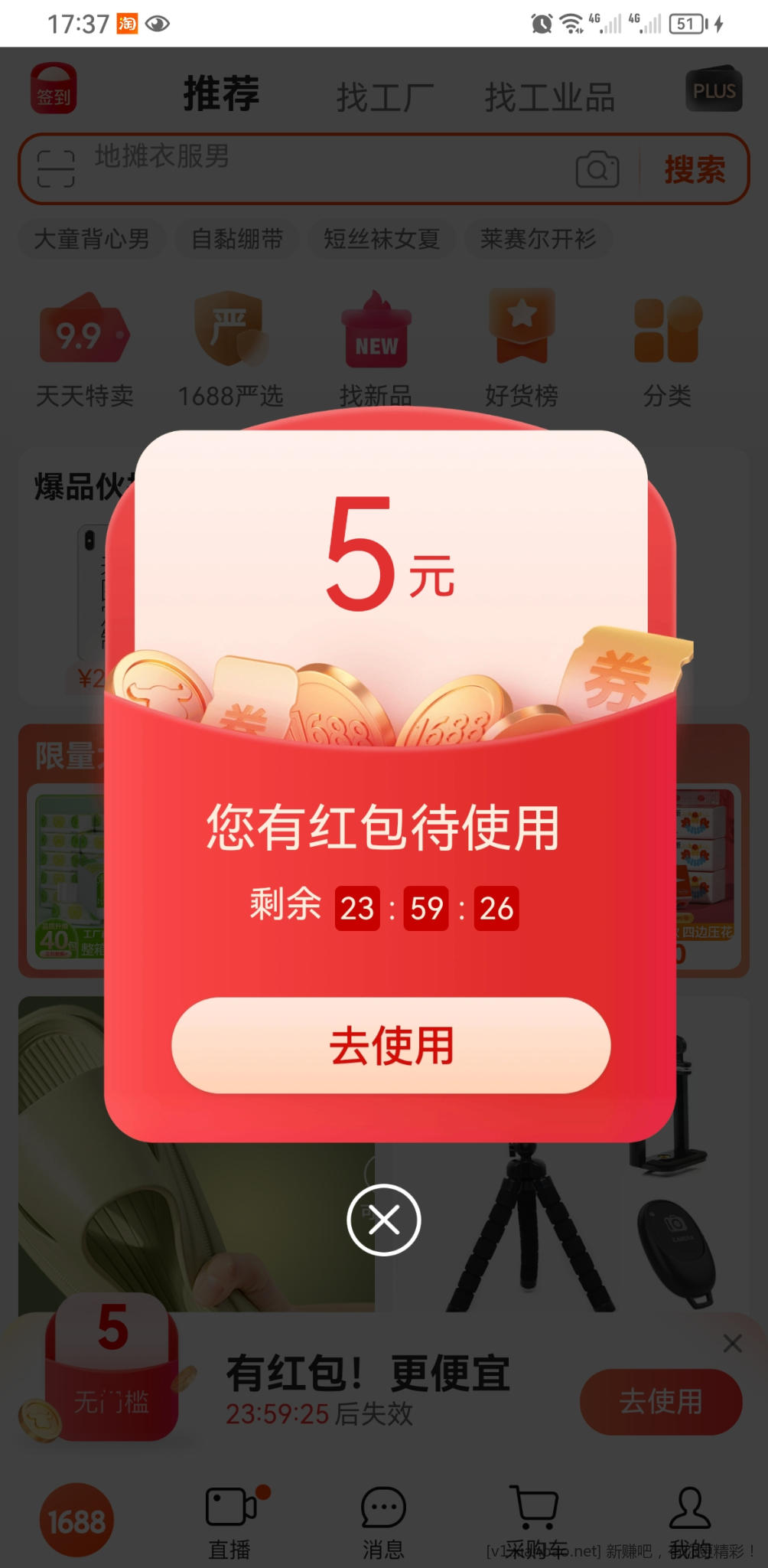 刚刚如果下载了1688app,,新人弹红包5元,可以0元买东西。东西很多,仔细筛选。