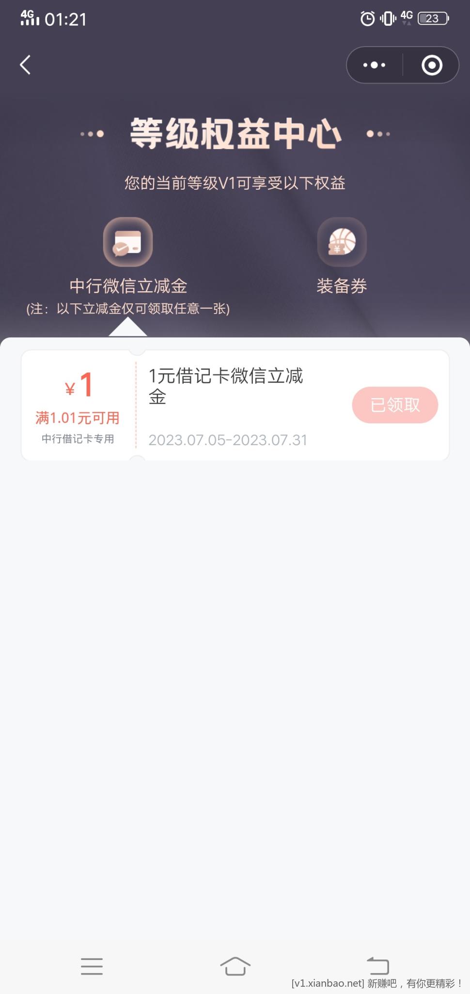 微信进入小程序“中银运动+”->能量驿站健步兑好礼->右上角“等级权益”->直接领取1元微信立减金
