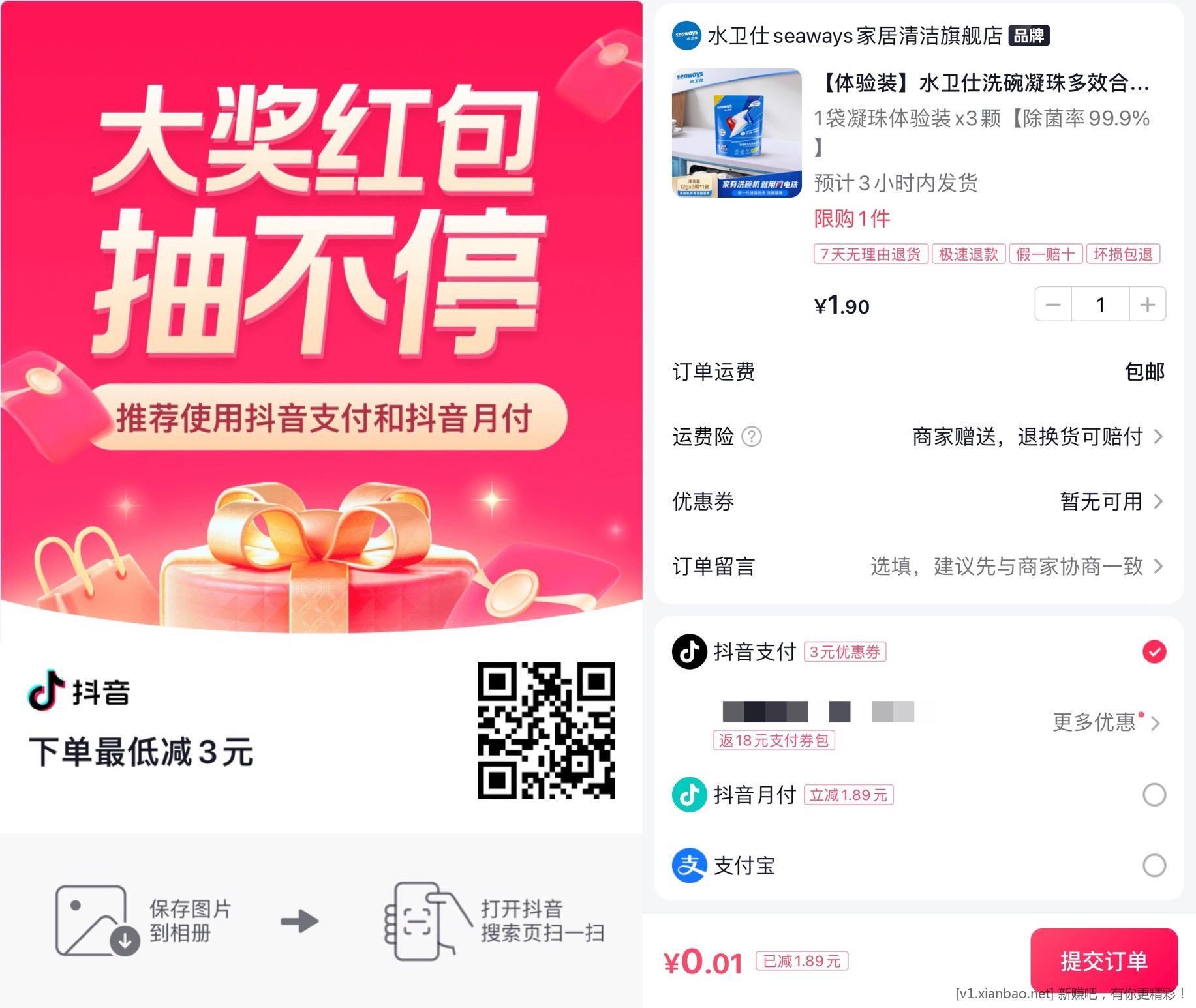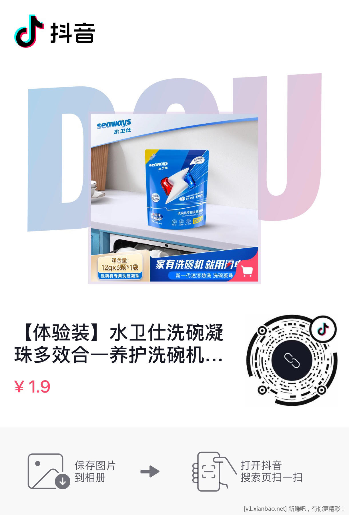 扫码领3块钱抖音支付券水卫仕洗碗凝珠拍下选择抖音支付,付0.01https://v.douyin.com/irUeY7V/