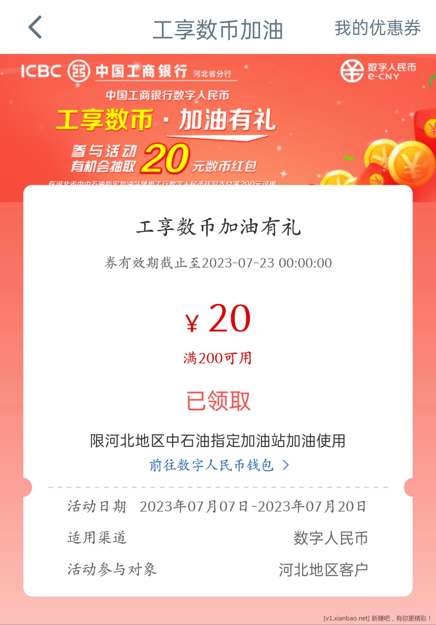 河北工行数币20元加油消费券