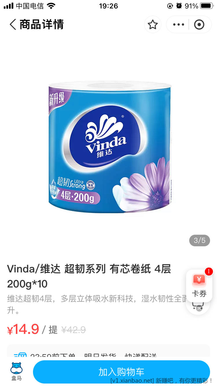 zfb搜索 盒马 新人首单 14.9 包邮三元&亚德纯牛奶牛奶12瓶250ml维达卷纸200g 10卷金龙鱼稻谷油2L商品很多 感觉卷纸和油比较划算 多号多撸