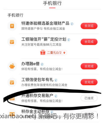 不知道分地区不,我广东的有这个任务。开通积存交易帐户,中3元立减金,下面那个主动积存就不要弄了5元水,刚好够手续费。还有一个关注公众号任务抽中1元,特邀任务我没中。