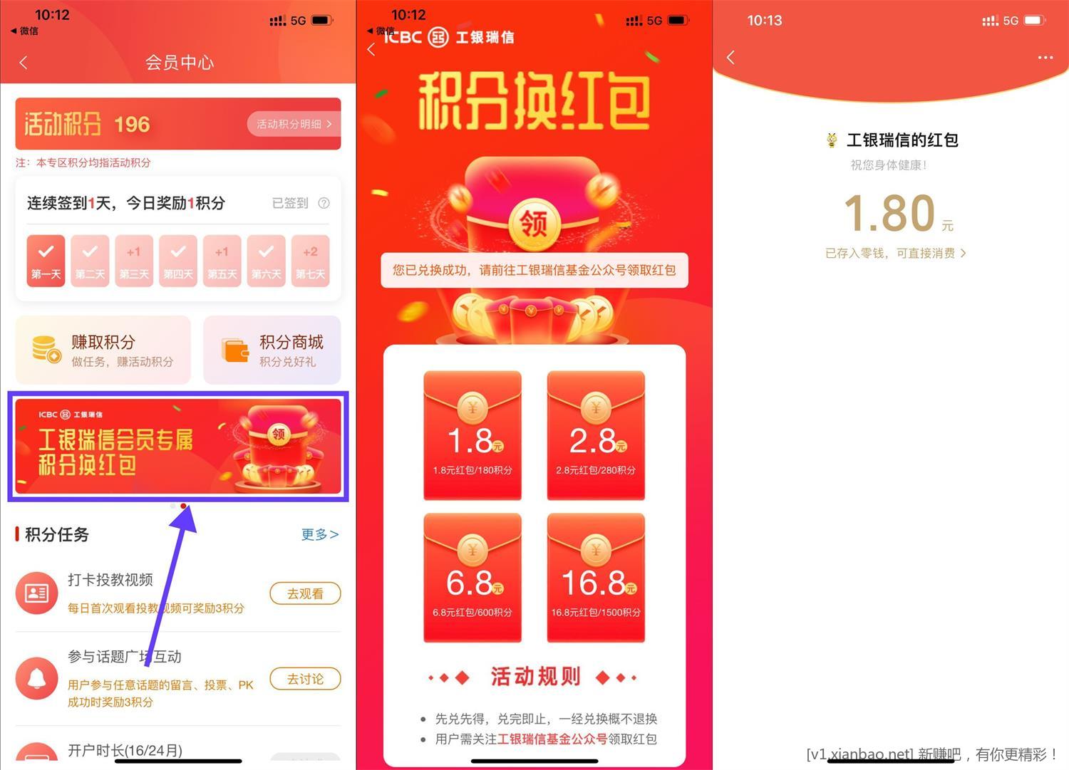 工银瑞信积分兑换1.8元红包