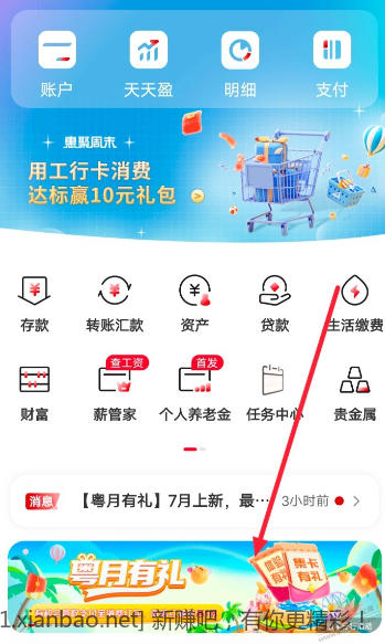 工行App,如图,最底下滚动广告,粤月有礼,点击进去后浏览4个任务即可抽奖,刚中3.88支付宝立减金~限广东,除深圳广州