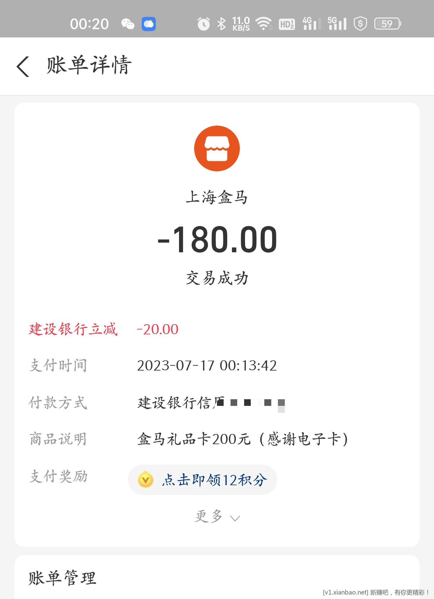 打开盒马app购买200盒马卡,选择建行xing/用卡付款,满200-20,给收货佬大约190左右。具体看图,坐标河北,各位自测,万一有就是大毛,。