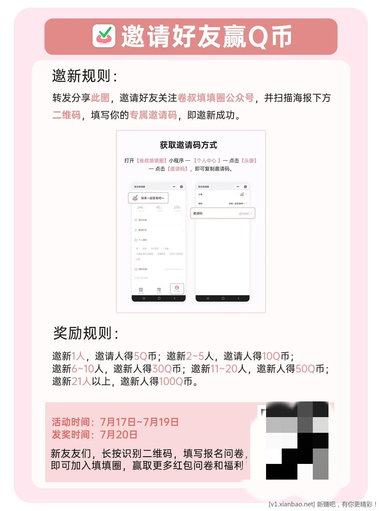 其实图中二维码没啥用,为了防止有人说我拉人头就打码了,链接可以自己关注腾讯的“卷叔填填圈”查看,自己的邀请码获取图中也有方式。