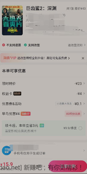 淘票票现在8.4预售场有很多19.9特惠票,叠加88vip优惠是15.9,还可以用80积分换早鸟优惠再减4就是11.9,我积分不够了所以没换但我觉得15.9也挺便宜了
