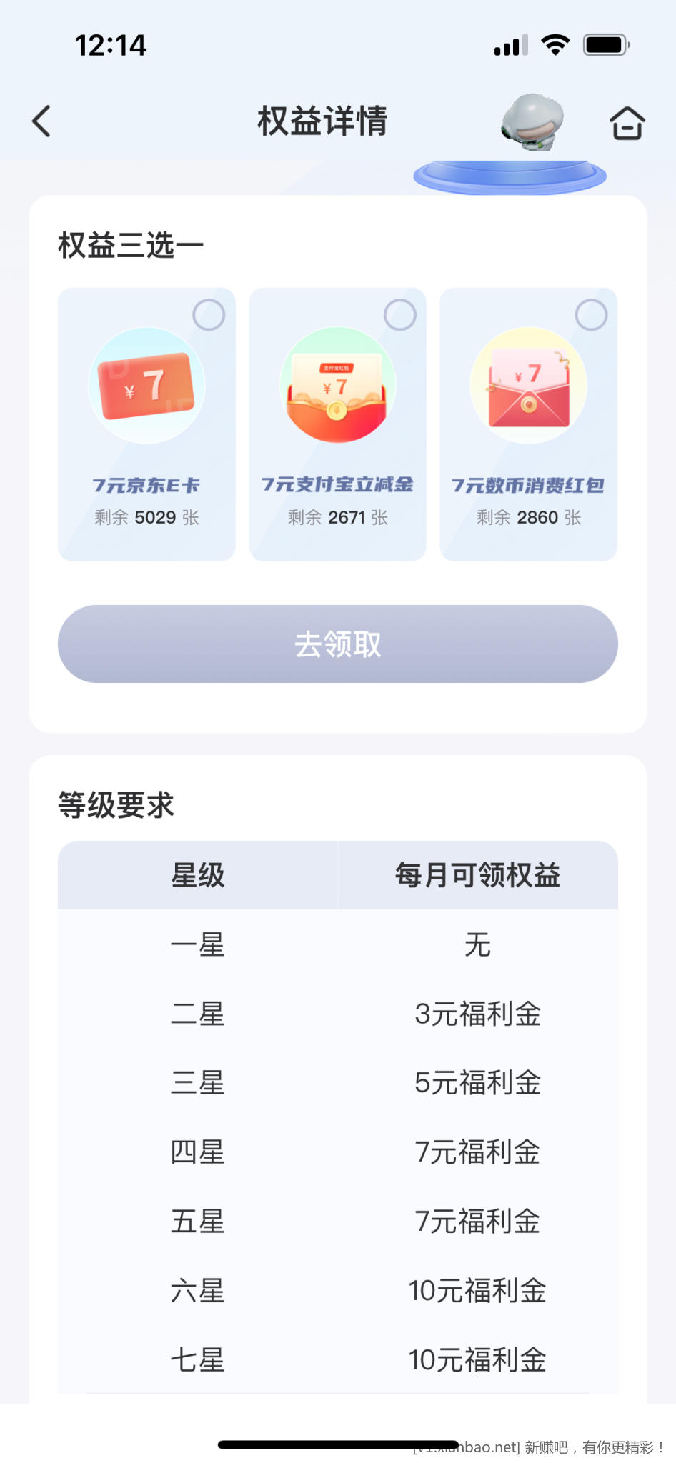 我的—权益专区1、福利金:2-7星级可领3-10元京东e卡、zfb立减金,数币红包(选1)2、立减金:4-7星级可领2-5元活动期:2023.6-2024.5