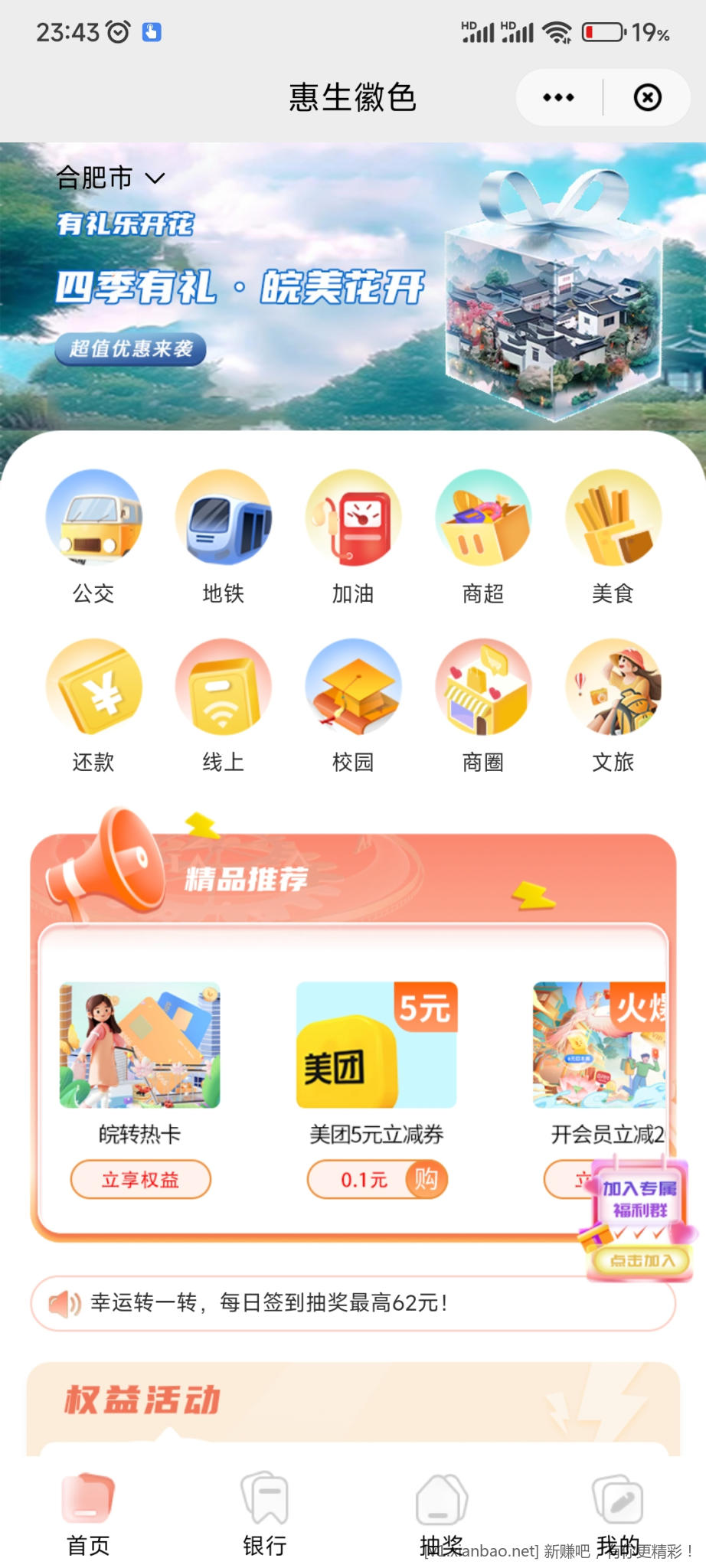 安徽的吧友少,又豆不肯加果,有时候安徽的毛都懒得发,打开ysf,惠声徽色,下面小格子,美团5元立减券,可冲美团,一号一个月4次。20毛
