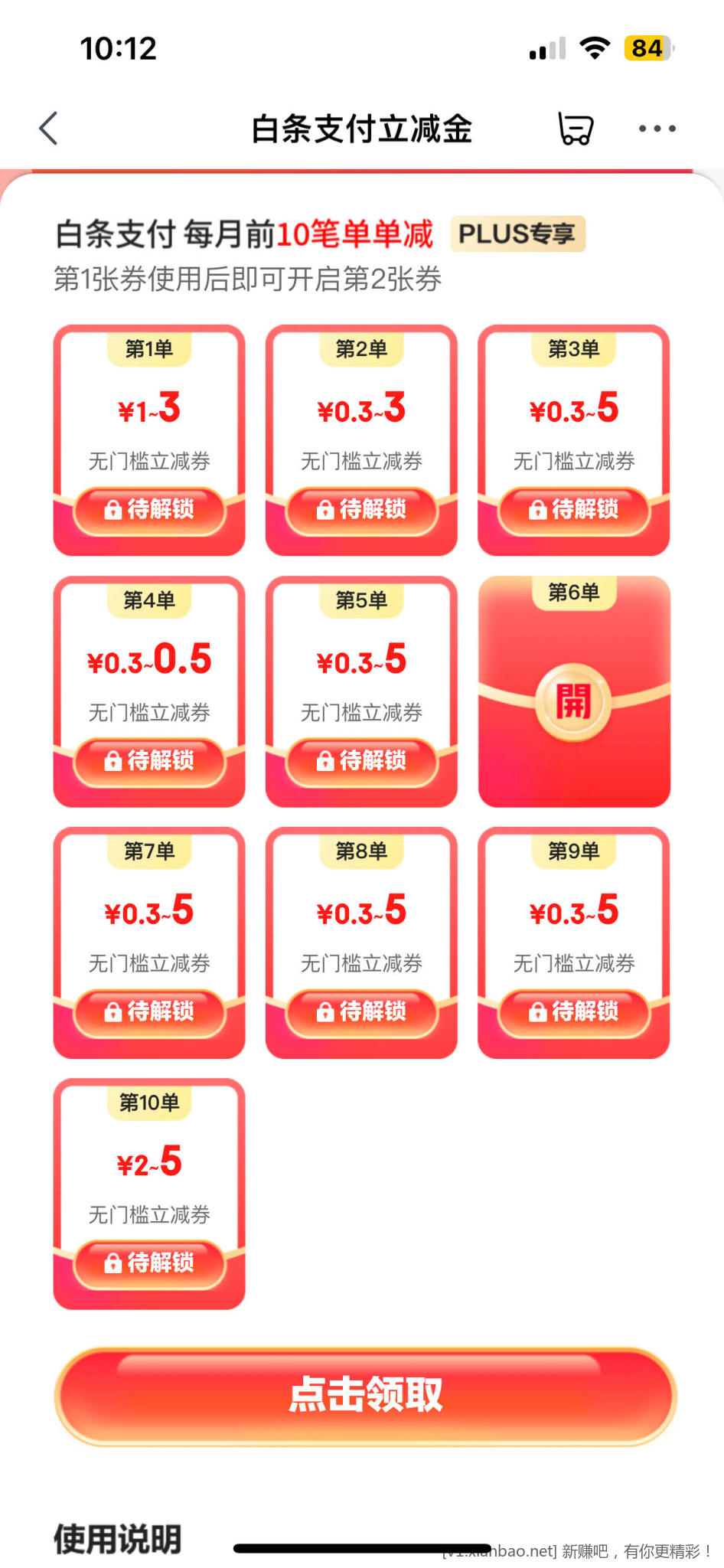 京东PLUS会员,白条支付立减金-每月领无门槛立减金在京东APP进入我的PLUS会员---会员权益,找到【京东白条】无门槛立减金活动时间7/26-8/31,每个月前10笔订单使用。当月有效。需使用第一张券后才能使用第二张,如此类推。