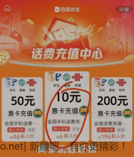 百度 搜 百度优选 6块钱冲10块钱话费