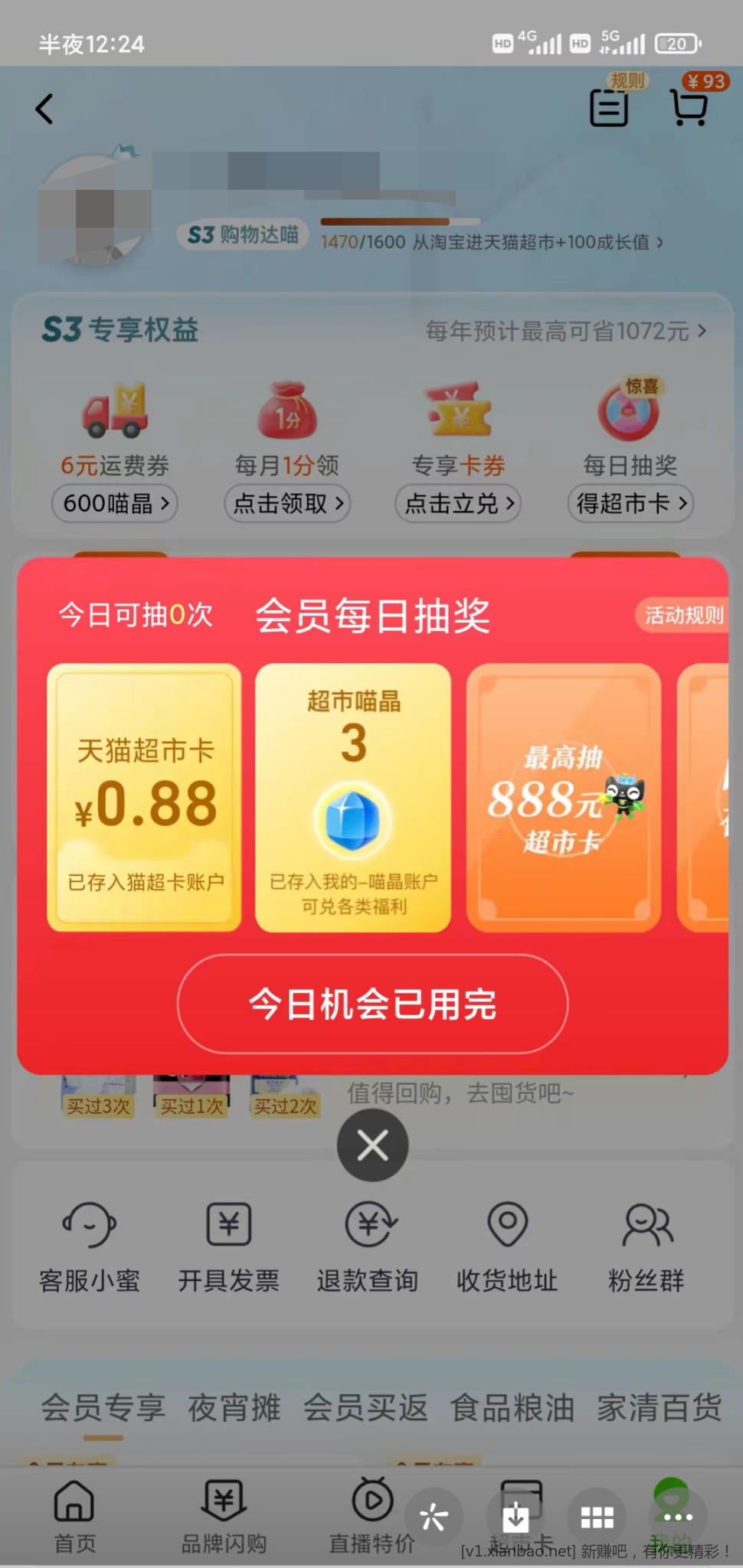 小毛天猫超市抽奖,猫超,我的,每天抽奖