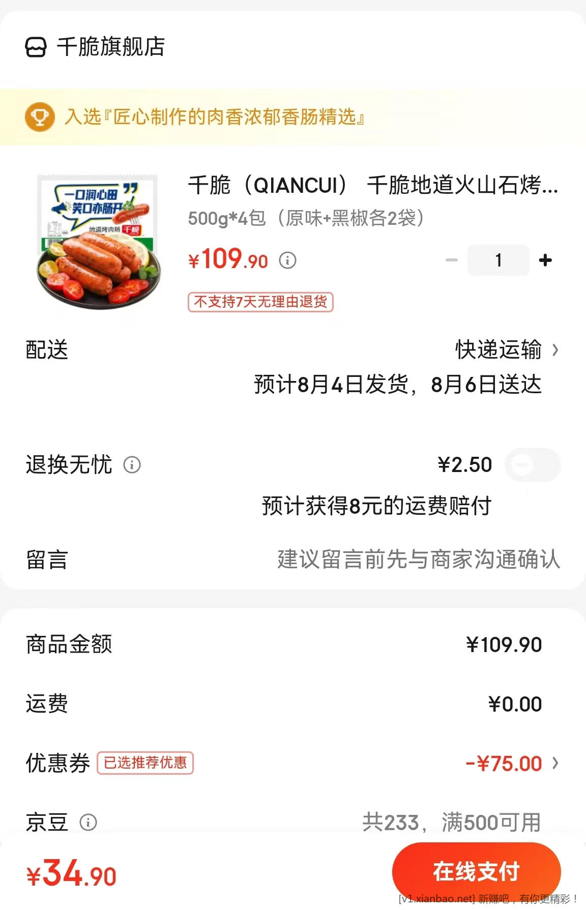 4斤最低 34.9到手千脆地道火山石烤肉肠500g*4包(原味+黑椒各2袋)https://item.jd.com/10045098455391.html券http://coupon.m.jd.com/coupons...a95WEtVzHsyXv7Q还需plus的5全品https://plus.m.jd.com/coupon/index?cu=true